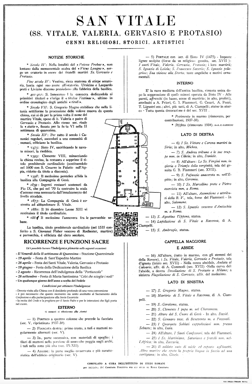 La Basilica di San Vitale è una Chiesa di epoca Imperiale risalente al IV secolo dedicata originariamente ai Santi Gervasio e Protasio, due giovani fratelli gemelli soldati martiri di origini milanesi, figli di San Vitale, anch’Egli soldato consolare e marito di Santa Valeria. Durante l’impero di Onorio, il primo dell’impero romano d’Occidente, sotto il pontificato di Papa San Siricio per onorare il ritrovamento miracoloso ad opera di Sant’Ambrogio dei corpi dei Santi Gervasio e Protasio, nel 386, la pia matrona Vestina lascia tutti i suoi averi all’Oratorio a loro dedicato, che verrà ristrutturato in Basilica a tre navate senza pareti e consacrata da Papa Innocenzo I nel 402, per evangelizzare il popolo romano della Suburra. Le caratteristiche architettoniche della Basilica imperiale di San Vitale è data da un gran numero di colonne (ancora visibili esternamente) che sorreggevano un tetto a capriate e una pianta con una navata centrale, fiancheggiata su ogni lato da un corridoio stretto, sempre porticato. La sostituzione di diversi muri con le colonne fece di questo ambienti una sorta di ‘open spaces’, anticamente aperto all’esterno, come un padiglione riccamente coperto e adorno ma senza pareti. Preti del Titulus Vestinae sottoscrivono gli atti del Sinodo romano del 499, mentre nella sottoscrizione del Sinodo del 595 compare l’appellativo Titulus Sancti Vitalis. Fu restaurata e dotata di ricchi doni da Papa Leone III (795 – 816), nuovamente restaurata in epoca medievale, e completamente rifatta dai Pontefici Sisto IV (1475) e Clemente VIII (1595): quest’ultimi interventi ridussero la Chiesa a una sola navata, al posto delle tre originarie, e portarono alla scomparsa del portico, chiuso e ridotto a vestibolo della Chiesa. Nel 1859 il Beato Pio IX fece costruire la caratteristica scalinata d’accesso che è in discesa a causa dell’innalzamento del piano stradale in seguito alla costruzione di Via Nazionale. Lavori di restauro effettuati nel 1937-38 hanno ripristinato il portico originario. Il Titolo cardinalizio, sospeso nel 1595, fu restaurato da Papa Leone XIII nel 1880, e lo stesso Pontefice eresse la Basilica in Parrocchia romana nel 1884.